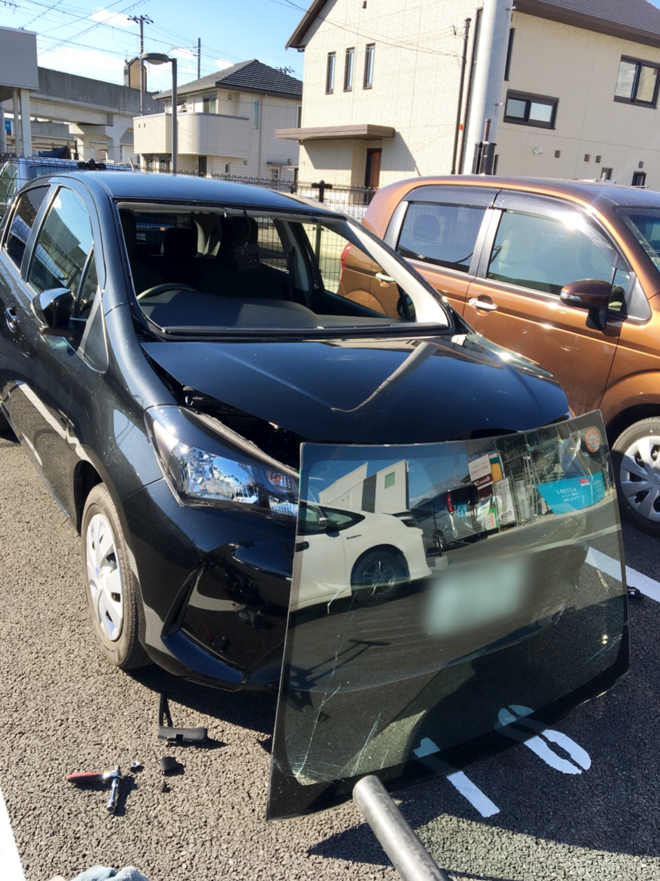 自動車ガラス交換 純正 ヴィッツ 出張 ラーメン!
