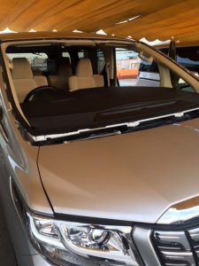 本日はアルファードのガラス交換! しかしでかいー! 先代のアルファードよりさらにでかいー。 2人でもやっとの作業です