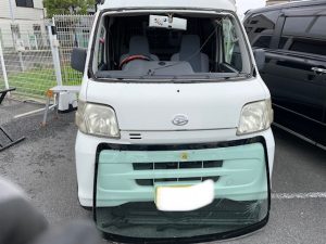 2021/06/19 ハイゼットのフロントガラスに、飛び石が当たり、ガラス交換を、出張作業しました。誠にありがとうございます。いつでもどこでも車のガラスの事で、お困りの方は、ご連絡ください。 大阪フロントガラス交換、 出張作業、格安、 車両保険