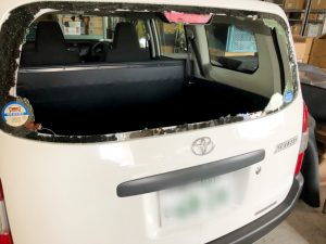 今回はトヨタ サクシードのリアガラス交換。 強化ガラスなんでバラバラです。掃除が大変!